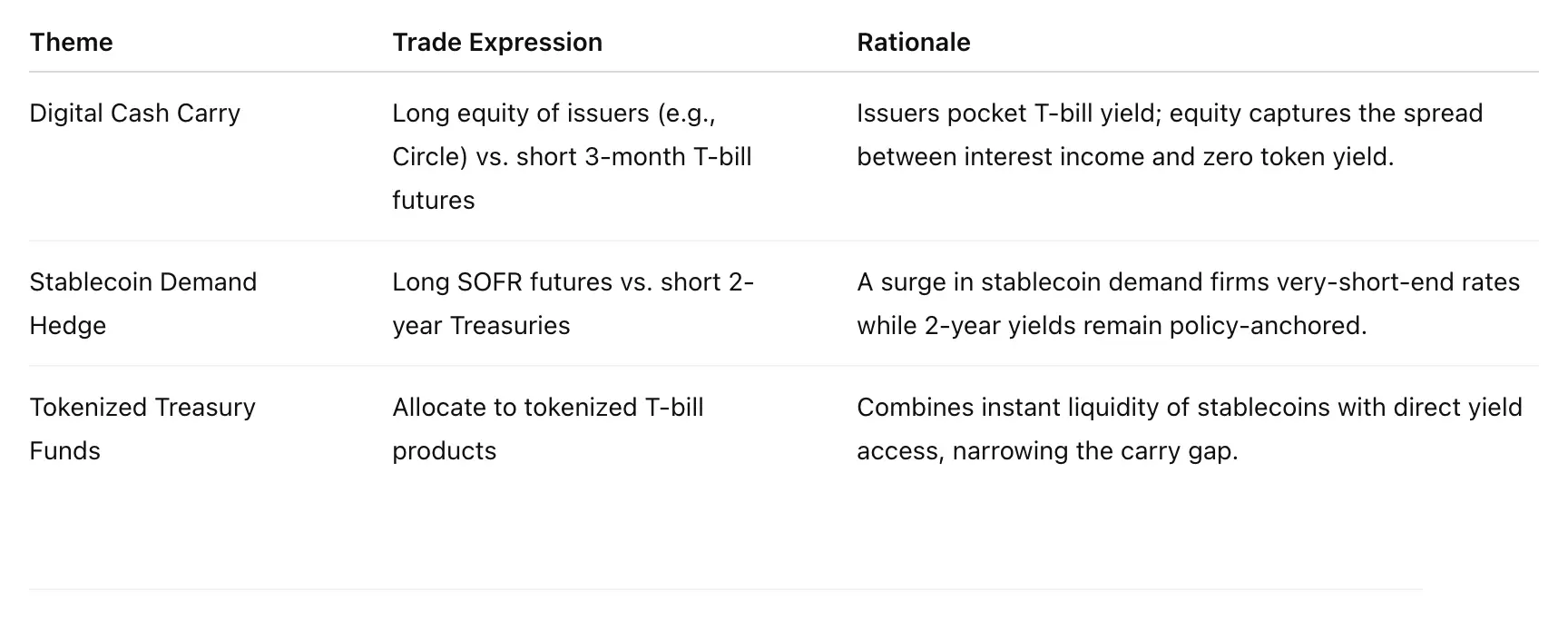 - 投资组合配置:对加密投资者:日常交易使用零息稳定币,闲置资金配置 tokenized T-bill 产品获取收益;对传统投资者:关注稳定币发行方的股权及其与储备资产收益相关的结构化票据;