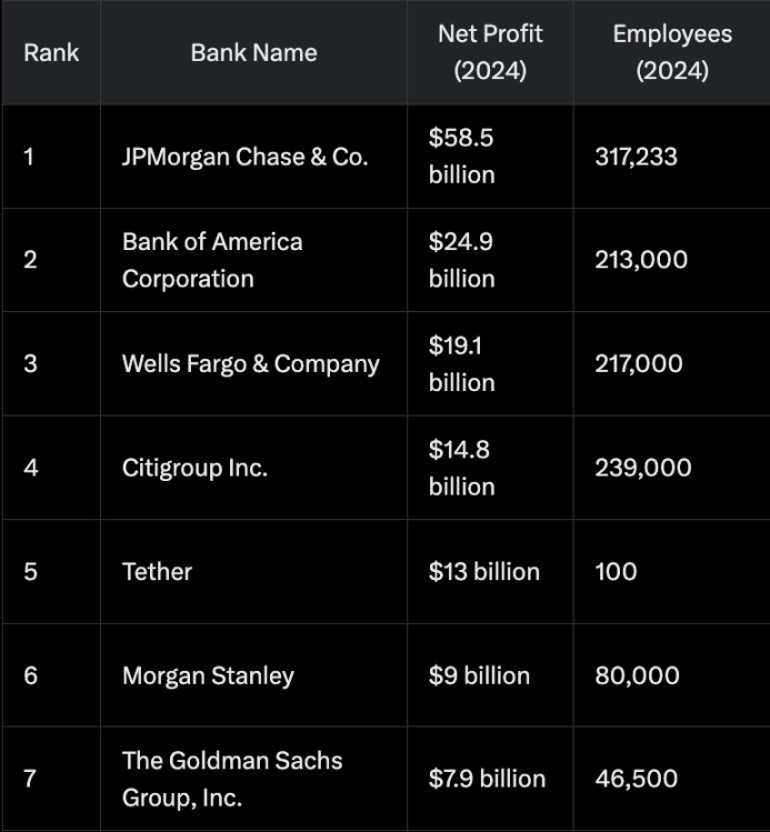 这样看来,只进不出,低风险的 Tether 完全是「躺着赚钱」。如上图,Tether 24 年利润为 130 亿美元,超过摩根士丹利和高盛等金融巨头,而其 100 名的员工数量更是只有后者的几百分之一,体现出极高的人效比。拥有相似利润水准的加密交易所币安拥有超过 5000 名的全球员工,在人效比上同样落后。赵长鹏近日在 X 上承认币安和 Tether 比起来 「far less efficient(效率低很多)」。究其原因,是因为 Tether 只需集中精力运营其最核心、利润最丰厚的 USDT 业务,同时 USDT 自身具有先行者效应和网络效应,市场对其的需求持续扩大,在不付出太多营销精力的情况下就能自然扩张。而加密交易所则业务繁杂、竞争激烈,需要上新币、维护客户、进行营销活动等,消耗大量的人力和资金成本。
