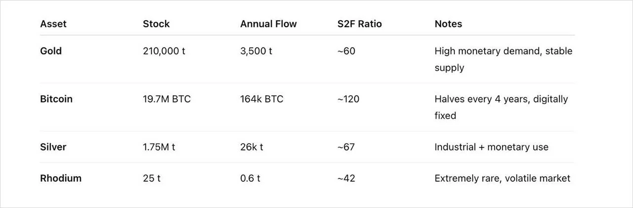 资产稀缺性常以库存/流量比(S2F)衡量,即现有总供应量与年度新增供应量之比。以稀缺资产 黄金 为例,其S2F比率为60(会因新金矿发现而小幅波动)。当前比特币S2F比率约为120,意味着其年度新增供应量仅为黄金的一半左右。此后每次减半,这一数字还将增加。