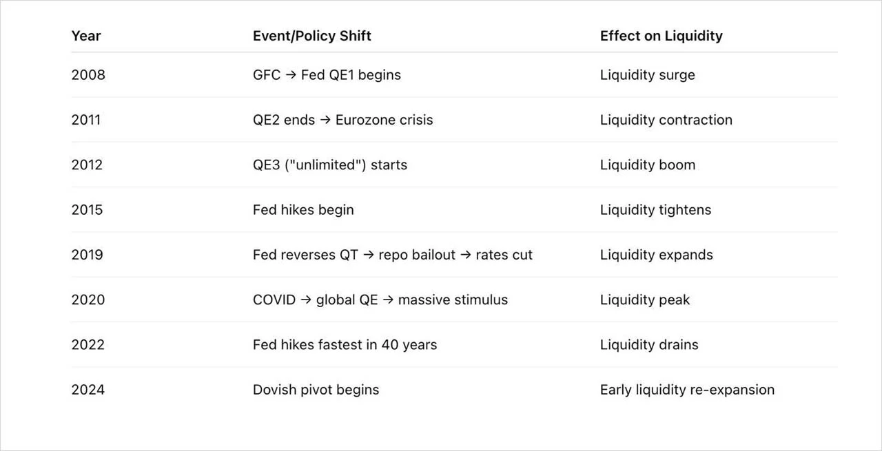 比特币与全球M2流动性的关联性,已由我们及多方机构多次阐释。值得注意的是,许多人认为流动性也同样遵循四年左右的周期性规律。尽管其精准度不及比特币减半那种节拍器那样高,但这种关联性确实存在。倘若该理论成立,比特币与其保持同步的现象便具备合理逻辑。