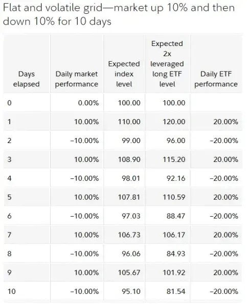 如果标的资产在交易日存在 +10% 和 -10% 的交替波动,2 倍杠杆 ETF 会发生什么?随着时间的推移,杠杆产品相对于其追踪的指数会逐渐恶化: