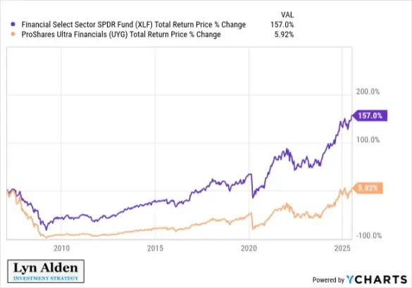 同样的情况也出现在波动性较大的股票长期历史中,比如金融板块或能源板块的 2 倍杠杆 ETF。在波动期间,它们的表现远远落后: