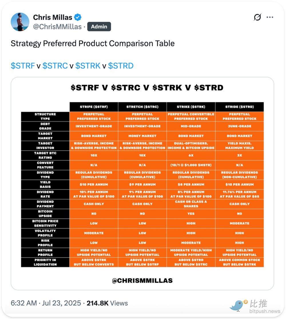 2025 年,Strategy 扩展了其产品线,新增了 STRK(可转换优先股,附带 8% 股息)、STRF(高级永续固定收益产品,附带 10% 股息)、STRD(初级永续固定收益产品,附带可选的 10% 股息)以及 STRC(可变利率永续优先股,初始股息率为 9%)。