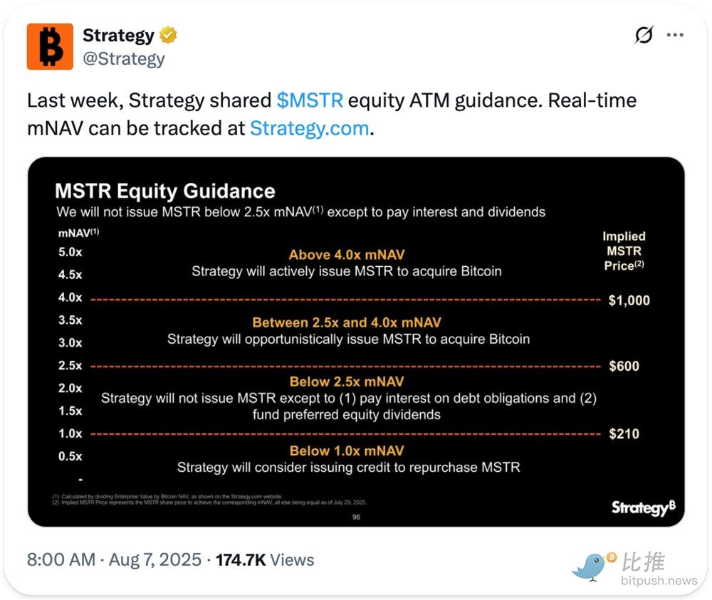 在其 7 月 31 日的第二季度财报电话会议上,Strategy 制定了新的普通股稀释准则,禁止在 MSTR 交易价格低于其比特币持股量 2.5 倍乘数时进行“按市价”股票销售,除非是为了支付债务利息和为优先股股息提供资金。