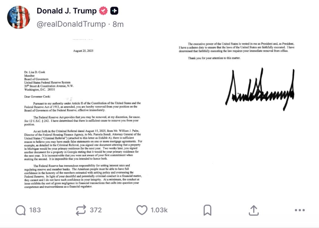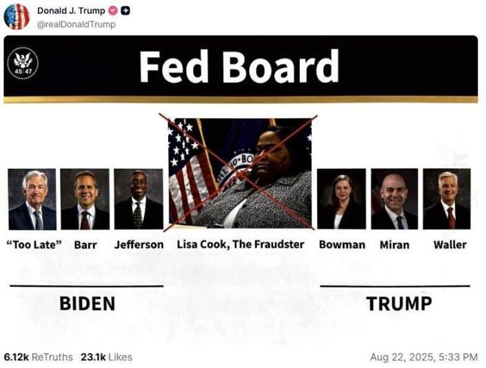 刚刚特朗普做出重大举动!他在社交媒体高调宣布,解除美联储理事丽莎·库克(Lisa Cook)职务「立即生效」。