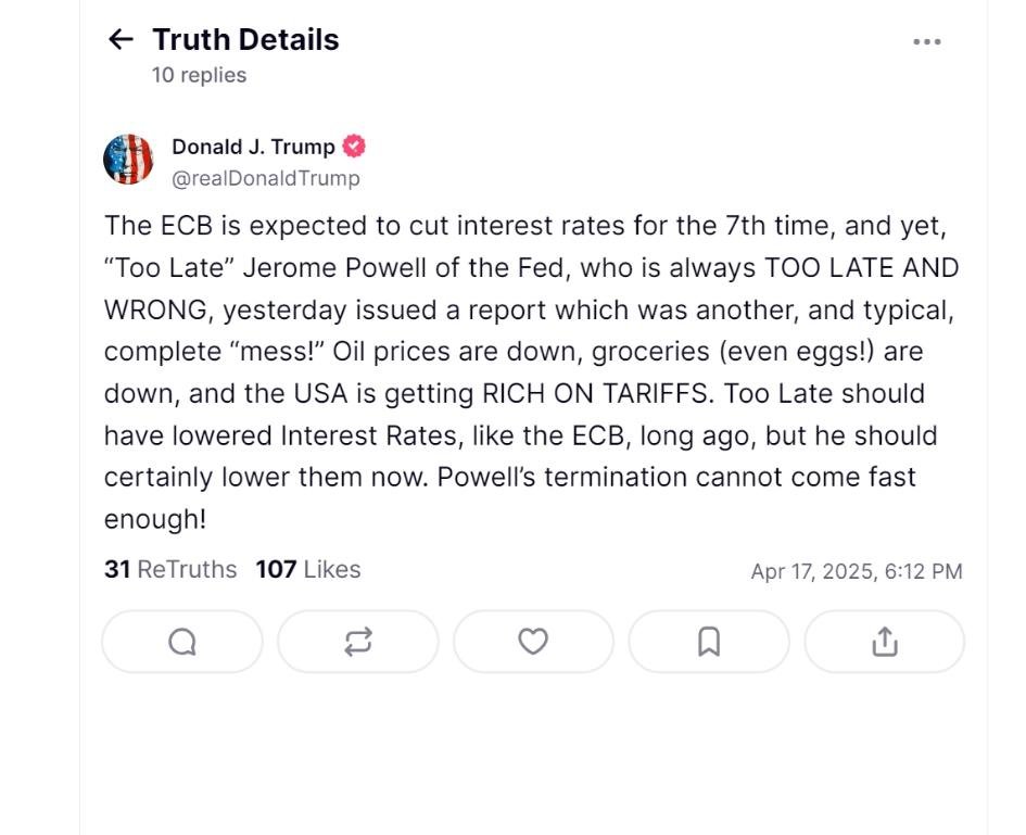这场风波并非空穴来风。回顾特朗普的首个任期,尽管他亲自提名鲍威尔接替耶伦,但在其后的加息周期中,特朗普曾多次在社交媒体上公开抨击鲍威尔,称其“疯狂”、“荒谬”,是“经济的最大威胁”。如今的表态,是这场持续数年矛盾的终极爆发。早在今年4月17日,特朗普曾连发3 文怒斥鲍威尔,情绪更是一层层递交,先是指责“鲍威尔 16 日发布的报告又是一团糟。他早就应该像欧洲央行一样降低利率,然而他总是太迟又犯错”,第二条直言“鲍威尔应该尽早下台”,第三条直接上升到威胁层面“如果我想让他离开,他很快就会离开的。我对他不满意。”
