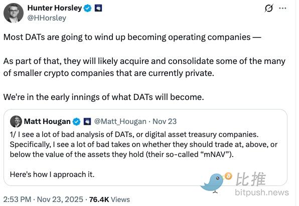 Bitwise CIO Matt Hougan 就在近日推文中指出,今年前六个月,DAT 股价呈现高度同步涨跌,很像一篮子“加密高杠杆指数”;但往后则会分化,“能够持续提升每股持币量的公司,会走向溢价交易;管理能力弱、资产结构差的 DAT 将持续折价,乃至面临被收购甚至清算。”