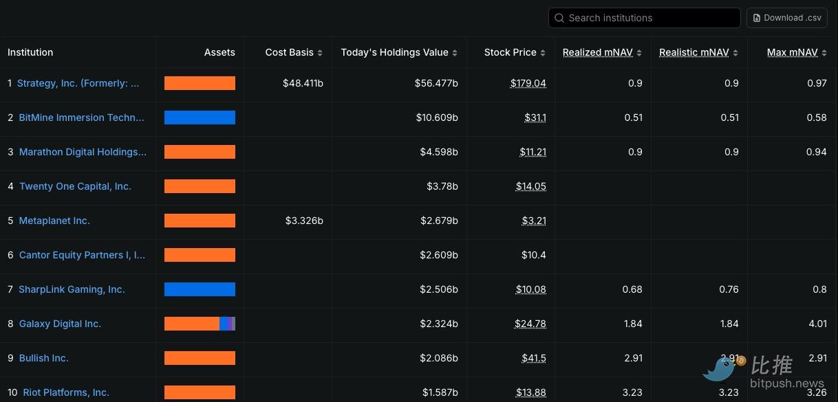 - Strategy 仍是全球最大 DAT,持有 BTC 价值达 566 亿美元;