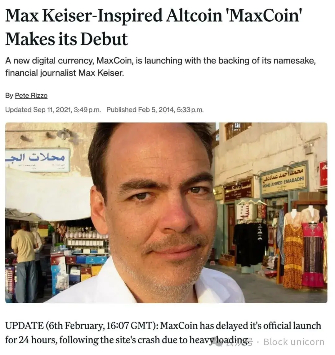 Cobie 与财经播音员 Max Keiser 合作,后者现在是萨尔瓦多总统的比特币顾问。这既说明当时大家有多认真,也说明这一切后来有多无足轻重。Maxcoin 的推出确实令人振奋。它是最早的“名人币”之一,有趣的是,它比“模因币”的概念早了大约七年。