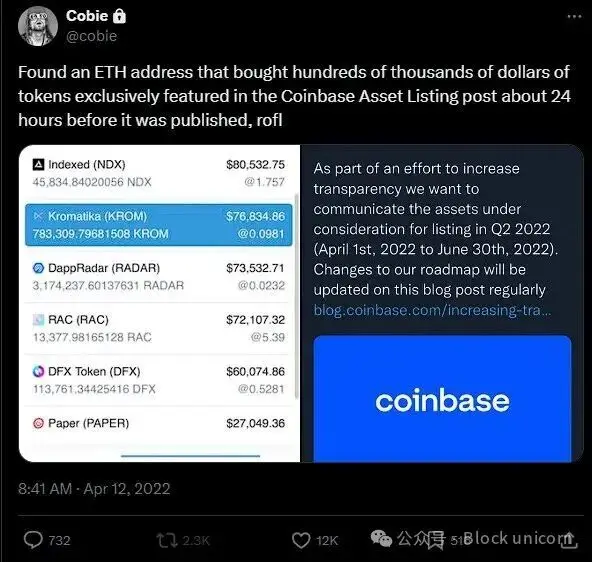 2022 年,Cobie 做了一件可能让他损失了金钱,但却为他赢得了另一种名声的事情。他公布了区块链数据,显示 Coinbase 员工存在可疑的交易活动。具体来说,有人似乎在 Coinbase 宣布即将上线某些代币之前就买入了这些代币,这正是教科书式的内幕交易。