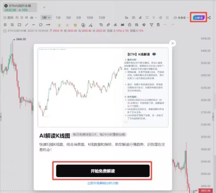 直到某个周三下午,市场波动不大,群里也异常安静。阿杰第N次打开交易软件,茫然地看着横盘已久的ETH,手指无意识地在屏幕上滑动。突然,界面角落一个不太起眼、却闪着微光的小图标吸引了他——“AI解读K线”。