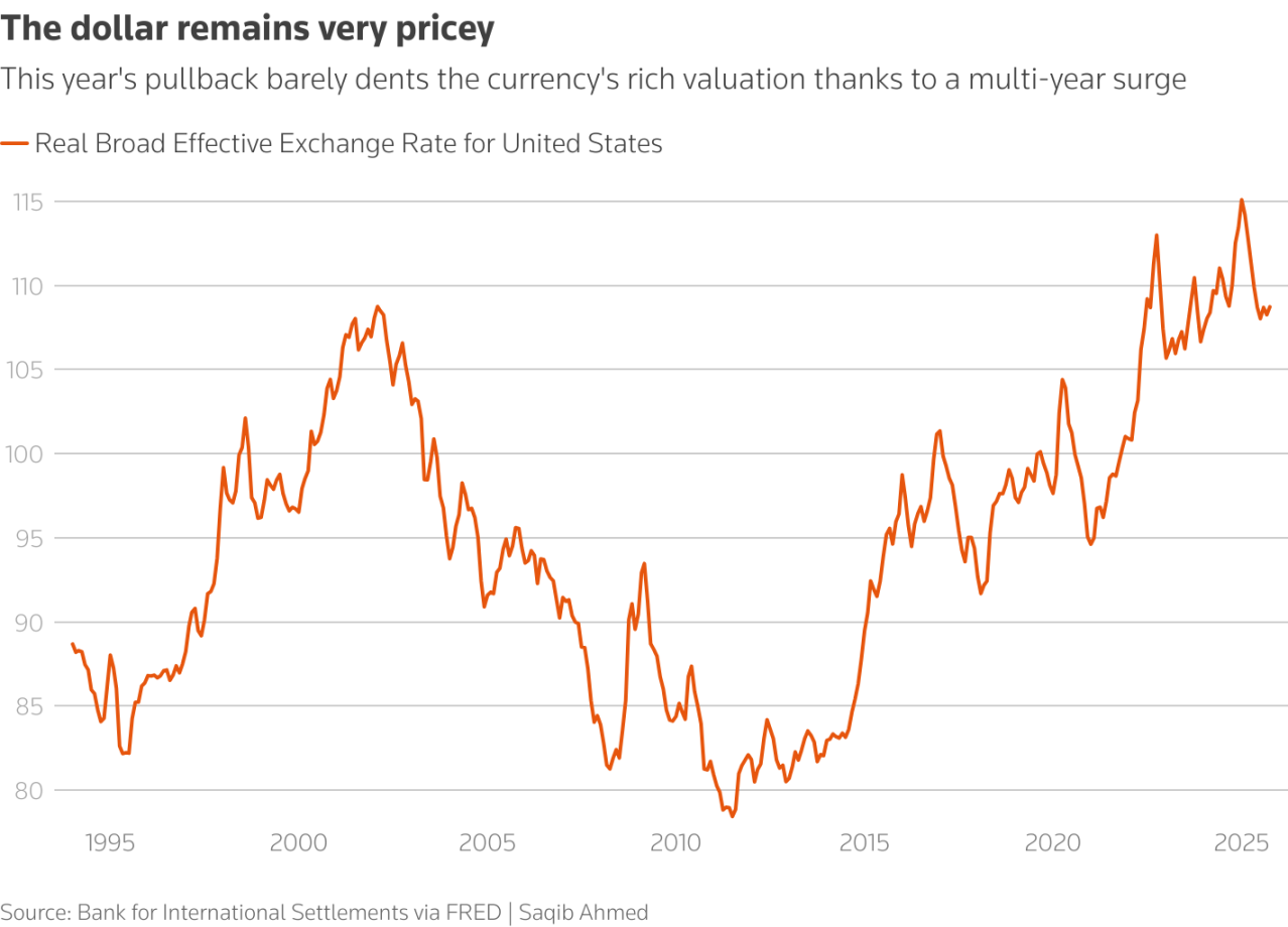 首先是估值回归的引力。 尽管美元指数已较 9 月低点反弹近 2%,但从基本面看,美元依然「贵」得离谱。国际清算银行(BIS)数据显示,截至 10 月,美元实际广义有效汇率(REER)虽然从 1 月的历史高点 115.1 降至 108.7,但仍处于绝对高位。全球企业支付公司 Corpay 首席市场策略师 Karl Schamotta 直言:「从基本面角度看,美元依然被高估。」