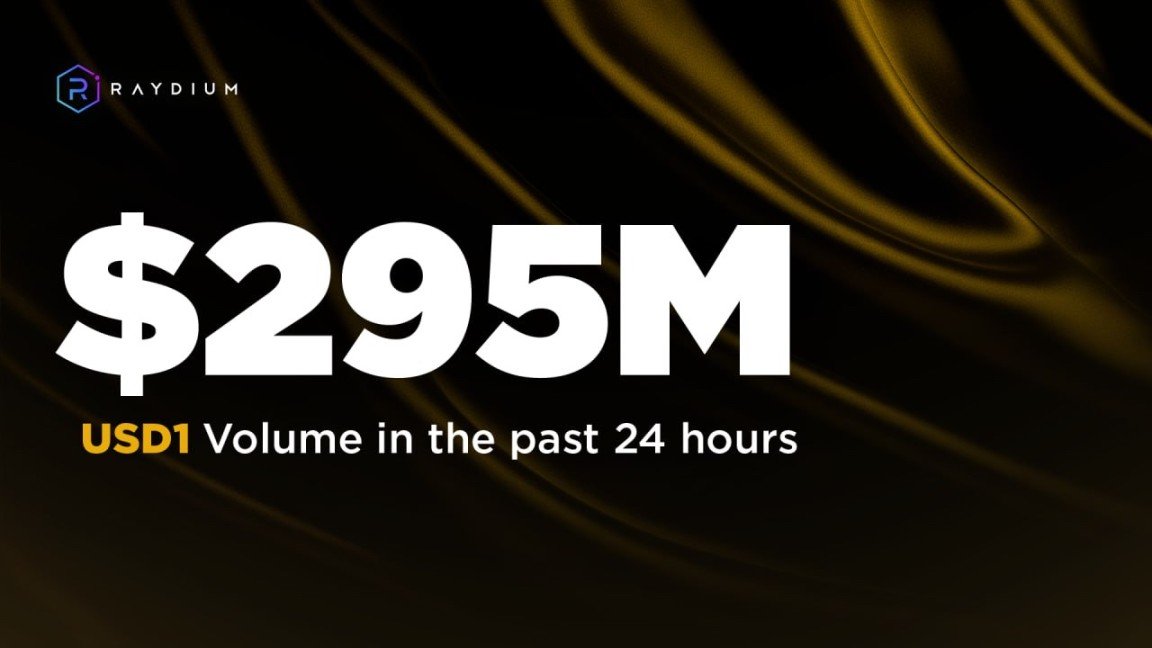 1 月 6 日(UTC+8),Raydium 发布数据显示,过去 24 小时内 USD1 在 Solana 网络上的交易量约为 2.95 亿美元。