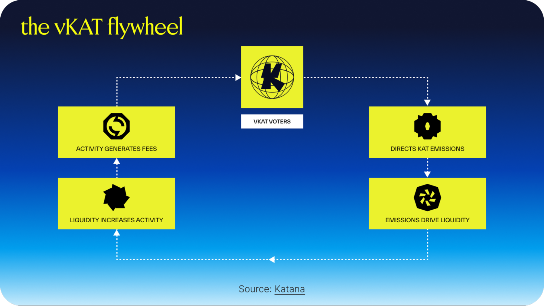 Katana 的 vKAT 飞轮模型,通过流动性、交易活动与费用收入的循环,推动生态持续增长