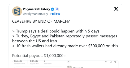 但在特朗普公开这一消息前,预测市场平台Polymarket上已有数个账户大手笔押注战争将于本周内结束。10个近期新开账户在Polymarket“美伊停火”市场投入数千美元,押注3月31日或4月15日前达成停火;这些账户合计押注约16万美元,若月底前停火成真,将获利超100万美元。