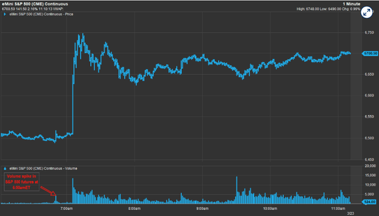 早盘期货市场通常流动性较低,这使得短暂的买卖爆发比常规交易时段更为显眼。尽管如此,这些交易仍令人侧目,因为任何在此时刻大量买入股票期货、同时卖出或做空原油期货的人,在几分钟后就赚取了巨额利润。